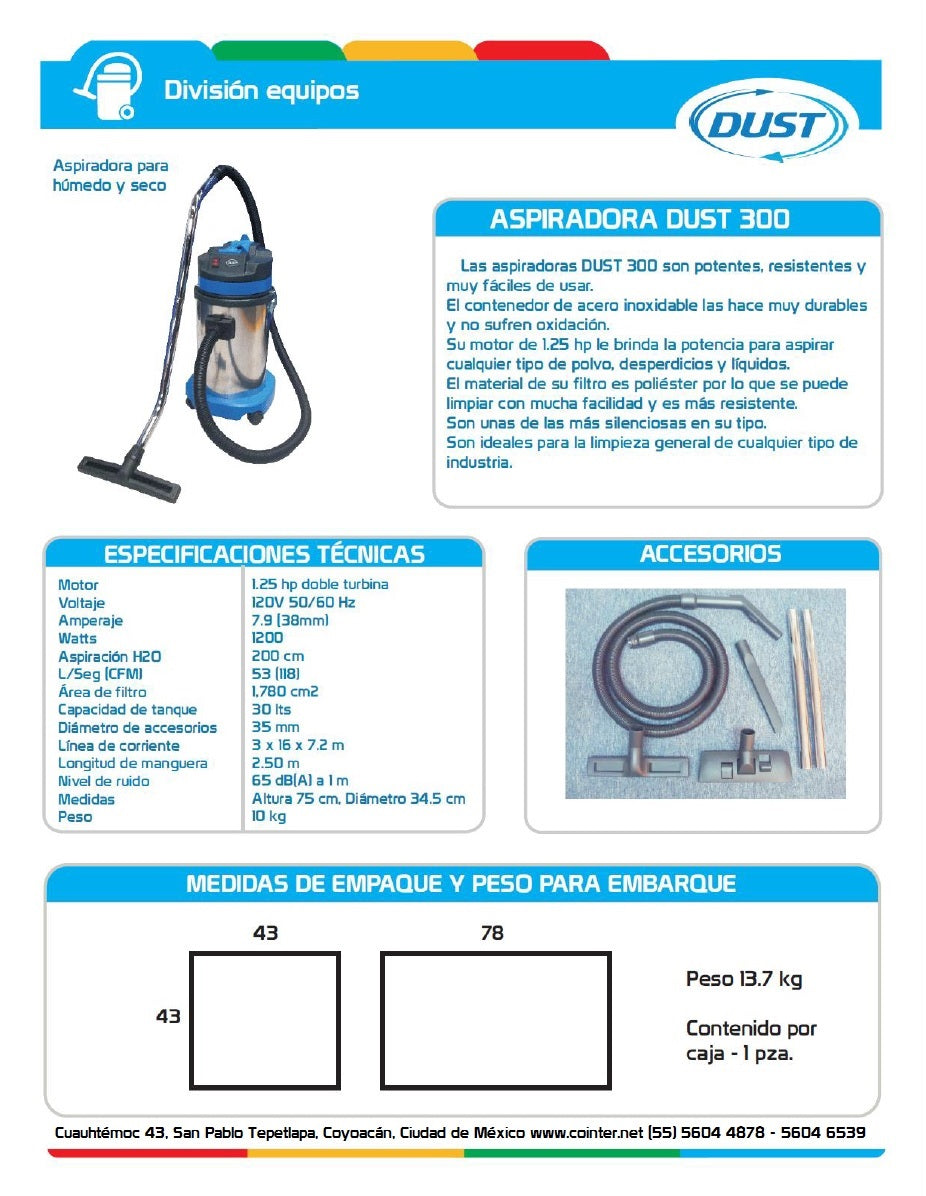 A pesar de su potente motor, la aspiradora Dust 300 opera de manera silenciosa con un nivel de ruido de solo 6 dB(A) a 1 metro, minimizando las molestias en entornos industriales. Con una altura de 75 cm, esta aspiradora es fácil de manejar y almacenar. La Dust 300 es una opción robusta y confiable para mantener cualquier espacio industrial limpio y bien mantenido, combinando capacidad, potencia y eficiencia en un solo dispositivo.