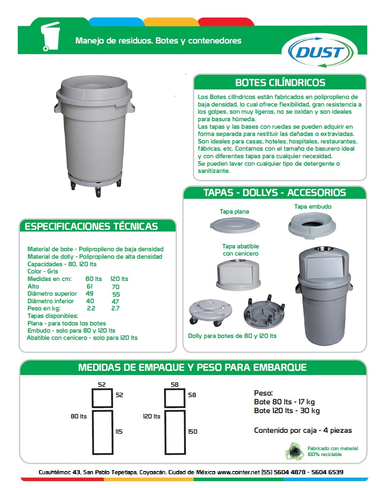Con medidas de 80 cm de alto, 61 cm de diámetro en la parte superior y 50 cm de diámetro en la parte inferior, y un peso de solo 5 kg, estos botes son fáciles de manejar y transportar. La tapa plana proporciona un cierre seguro que ayuda a contener los residuos y mantener el área circundante limpia y libre de olores. Además, las tapas y las bases con ruedas (dolly) se pueden adquirir por separado, permitiendo una fácil reposición en caso de daños o pérdidas, y facilitando la movilidad del bote para una mayor comodidad y eficiencia.