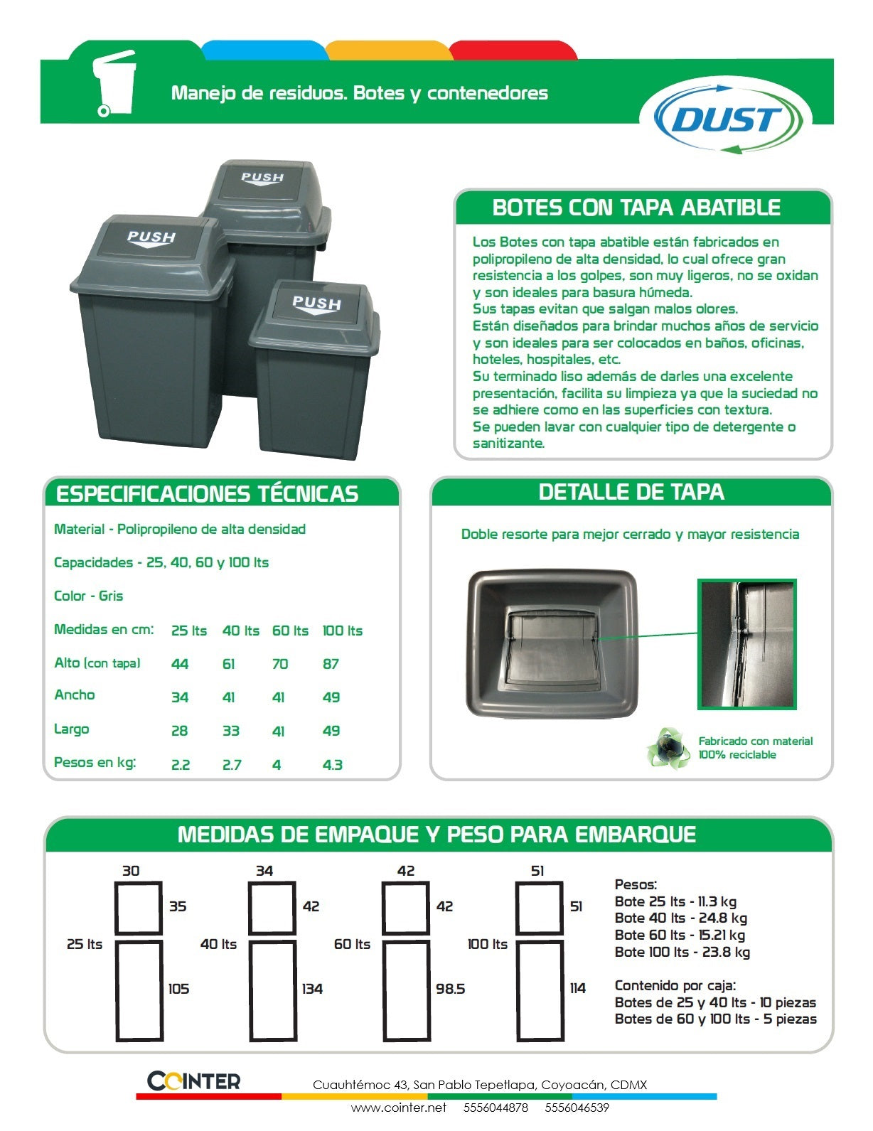 Fabricados en polipropileno de alta densidad, estos botes ofrecen una excelente resistencia a los golpes, son muy ligeros y no se oxidan, lo que los hace perfectos para cualquier tipo de desecho. La tapa abatible es eficaz para evitar la propagación de malos olores, manteniendo los espacios frescos y limpios. Diseñados para brindar utilidad por muchos años, estos botes representan una inversión duradera para cualquier establecimiento.