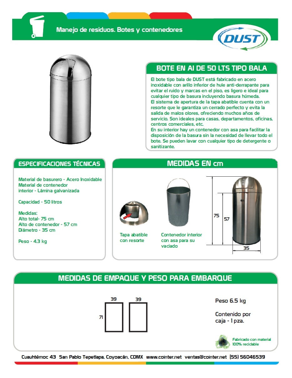 Con una capacidad de 50 litros y medidas de 75 cm de alto y 35 cm de diámetro, este bote es práctico y funcional. Su limpieza es sencilla, ya que se puede lavar con cualquier tipo de detergente o sanitizante, asegurando una higiene óptima. Este bote de acero inoxidable tipo bala de DUST es una opción duradera y versátil para mantener cualquier espacio ordenado y libre de residuos.