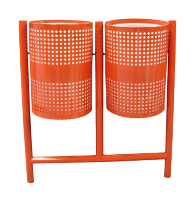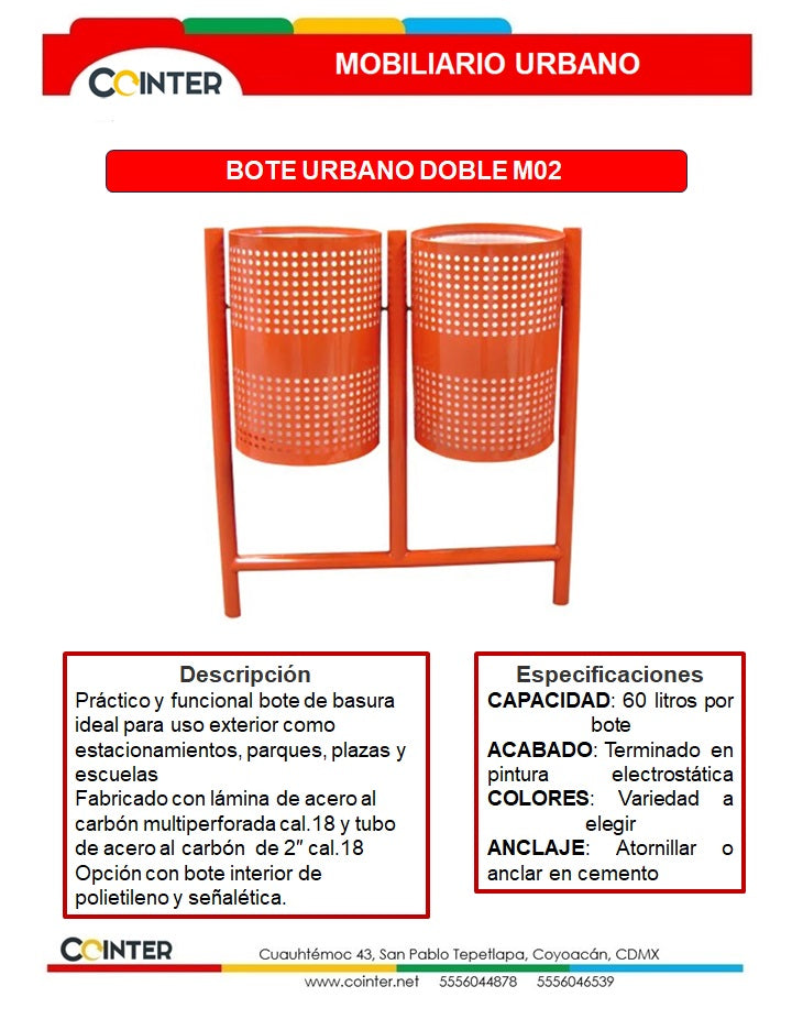 El bote de basura doble M02 combina funcionalidad y resistencia en un diseño adaptado para uso intensivo en exteriores. Fabricado con lámina de acero al carbón perforada calibre 18 y tubos de acero de 2″ calibre 18, ofrece durabilidad y estabilidad en condiciones ambientales variadas. Cada uno de los dos contenedores tiene una capacidad de 60 litros, perfecto para estacionamientos, plazas, parques y escuelas. Su acabado en pintura electrostática está disponible en variedad de colores, permitiendo la personalización según las necesidades del espacio urbano. Puede ser anclado en cemento o atornillado al suelo para mayor seguridad.