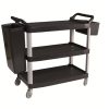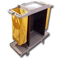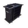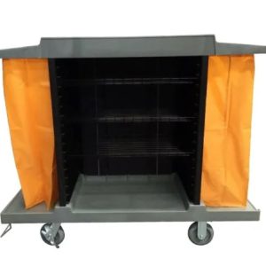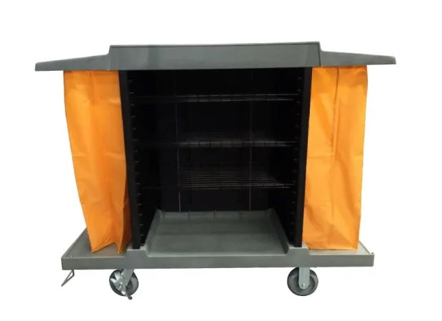 El carro camarista DUST está diseñado para transportar todo la necesario para realizar el mantenimiento de habitaciones en hoteles, hospitales, etc. Su charola superior tiene divisiones para la colocación de productos para realizar el aseo de la habitación y los que se dejan para el aseo personal del huesped. Cuenta con 3 entrepaños de altura variable para el almacenaje de toallas, sábanas, colchas, cobijas limpias etc. Una de las bolsas laterales se puede destinar para la ropa sucia y la otra para la basura.