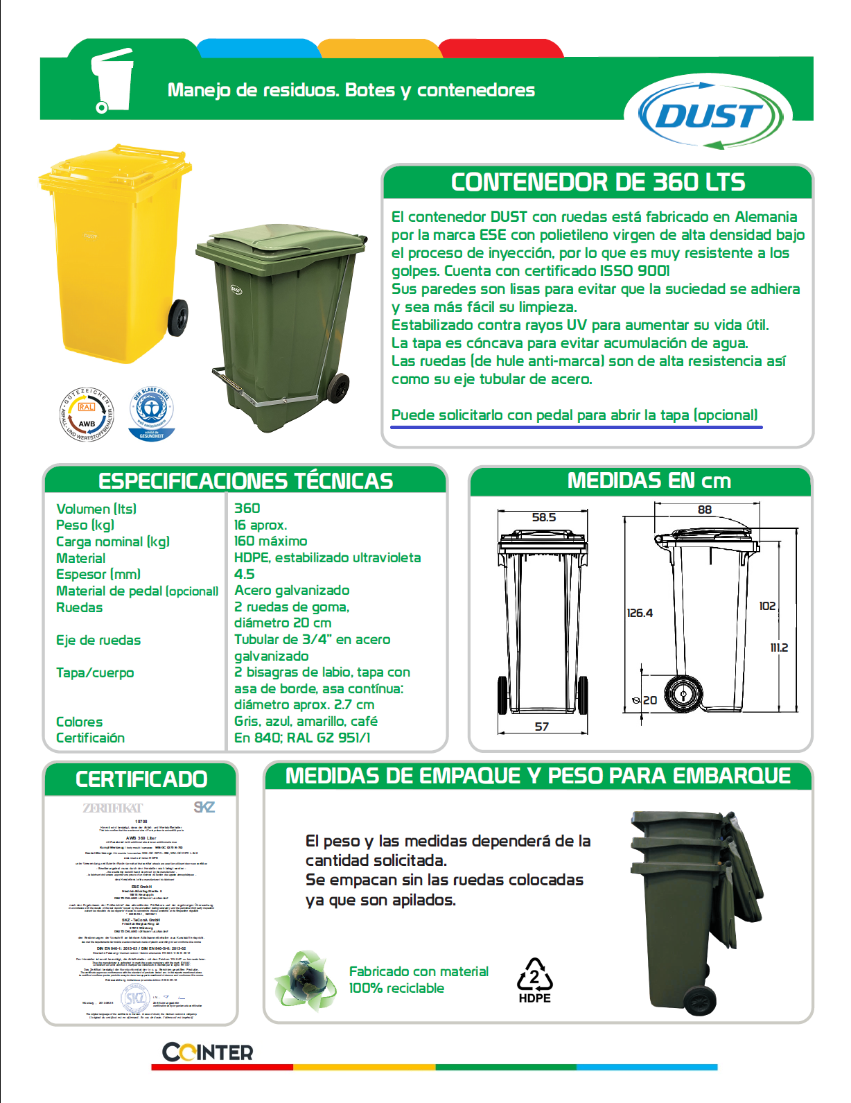 Con una capacidad de 360 litros y un peso de 16 kg, este contenedor es ideal para manejar grandes volúmenes de residuos, facilitando su recolección y disposición. El pedal de acero galvanizado asegura una apertura y cierre resistentes y duraderos, garantizando un uso prolongado sin problemas. Equipado con dos ruedas de goma y un eje tubular de 3/4″ en acero galvanizado, el contenedor es fácil de maniobrar incluso cuando está completamente lleno, ofreciendo una movilidad sin esfuerzo.