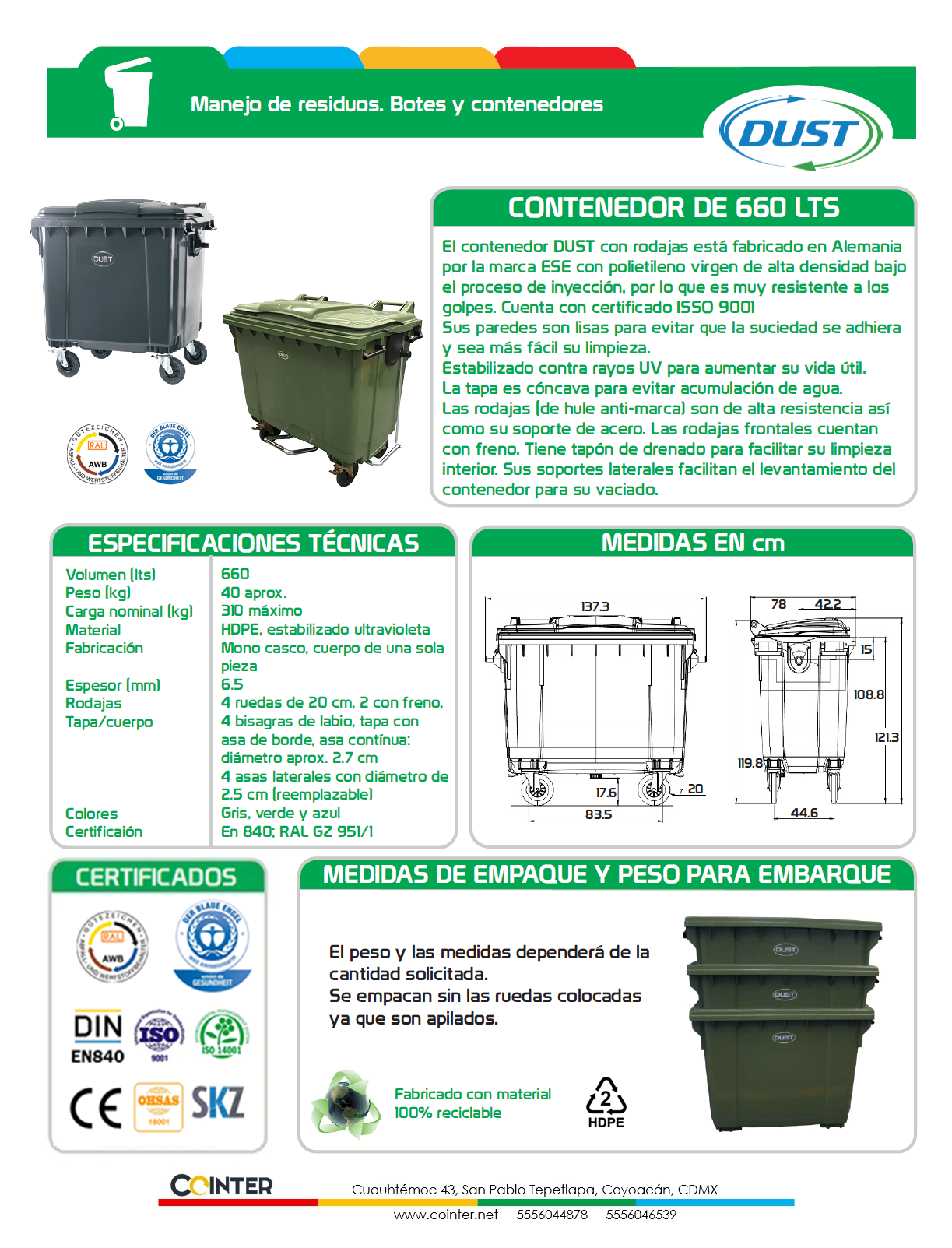 Con una impresionante capacidad de 660 litros, este contenedor es ideal para manejar grandes volúmenes de residuos, facilitando su recolección y disposición. Fabricado con materiales de alta calidad, este contenedor está construido para resistir el uso intensivo y las condiciones climáticas adversas, garantizando una larga vida útil y un rendimiento fiable.