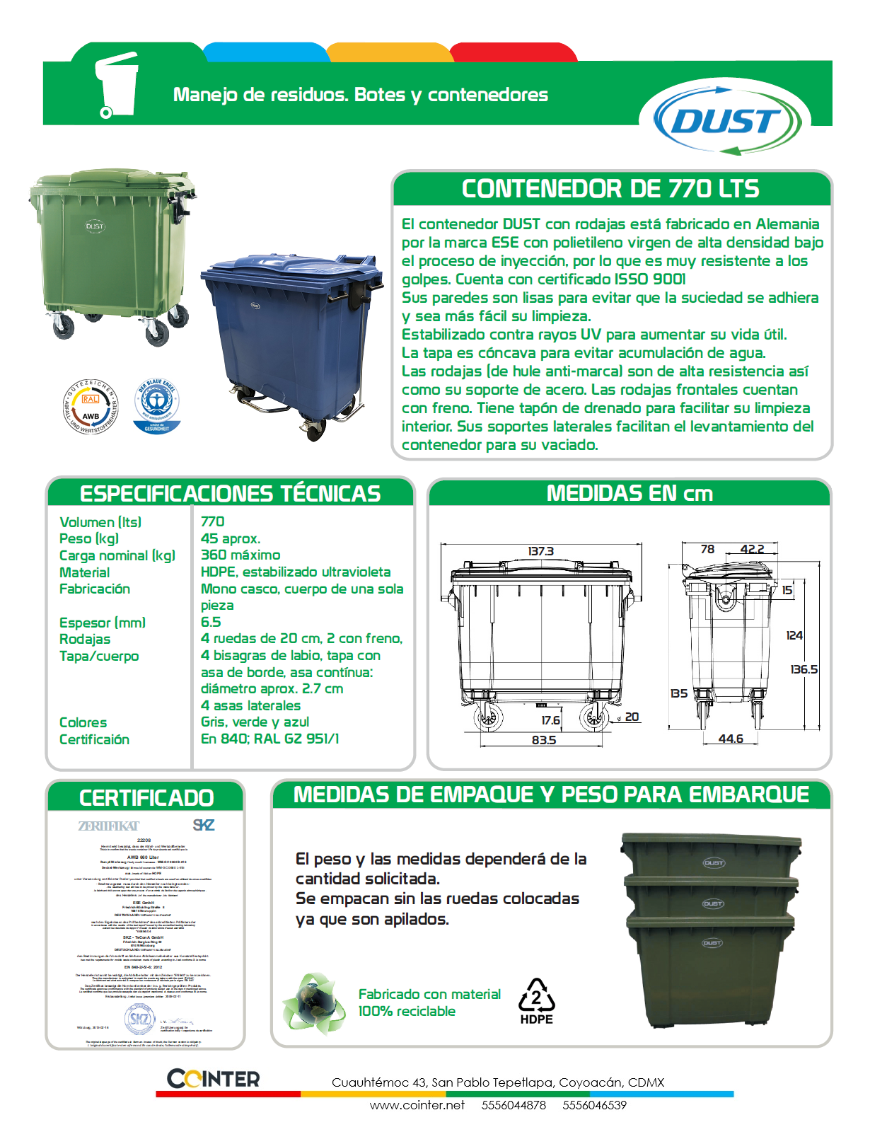 Fabricado con materiales de alta calidad, este contenedor es extremadamente resistente y duradero, capaz de soportar condiciones climáticas adversas y un uso intensivo. Está equipado con ruedas de alta resistencia que permiten una movilidad fácil y sin esfuerzo, incluso cuando el contenedor está completamente lleno, asegurando una operación eficiente y conveniente.