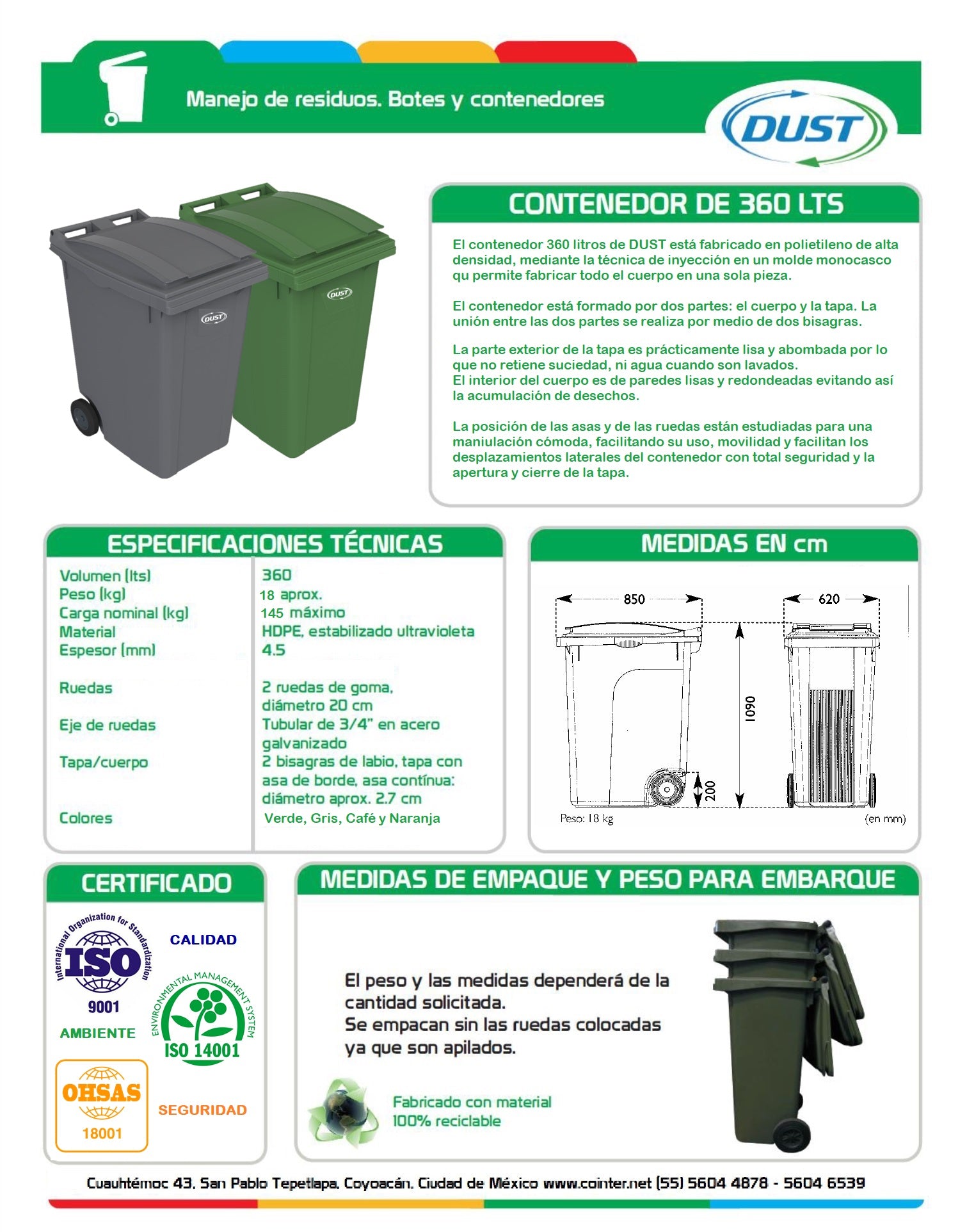 Este contenedor DUST de 360 litros es ideal para la gestión eficiente de grandes volúmenes de residuos. Está fabricado mediante la técnica de inyección en molde monobloque, lo que asegura una estructura robusta y sin uniones, fabricado en polietileno de alta densidad estabilizado contra rayos UV para resistir las condiciones exteriores adversas. Su diseño cuenta con dos ruedas de goma y un eje de acero galvanizado, lo que facilita su movilidad y manejo. Además, su tapa está diseñada para prevenir la acumulación de residuos y agua, asegurando un cierre seguro y fácil limpieza.