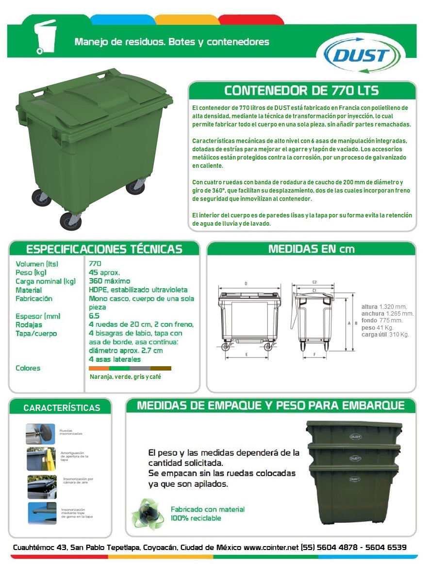 Este contenedor de 770 litros de la marca DUST está fabricado en Francia utilizando polietileno de alta densidad con la técnica de transformación por inyección, lo que permite su fabricación en una sola pieza sin necesidad de añadir partes remachadas. Este contenedor cuenta con características mecánicas de alto nivel, como seis asas de manipulación integradas y dotadas de estrías para mejorar el agarre y apilamiento. Los accesorios metálicos están protegidos contra la corrosión mediante un proceso de galvanizado en caliente. Además, sus cuatro ruedas con banda de rodamiento de caucho y freno de seguridad hacen que sea muy fácil de desplazar y seguro de manejar.