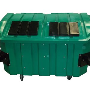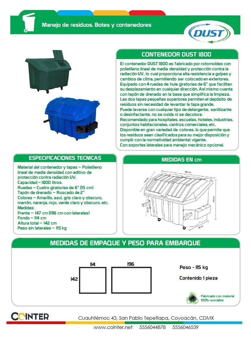 Con soportes laterales para manejo mecánico opcional.El contenedor DUST 1800 es fabricado por rotomoldeo con polietileno lineal de media densidad y protección contra la radiación UV, lo cual proporciona alta resistencia a golpes y cambios de clima, permitiendo ser colocado en exteriores.