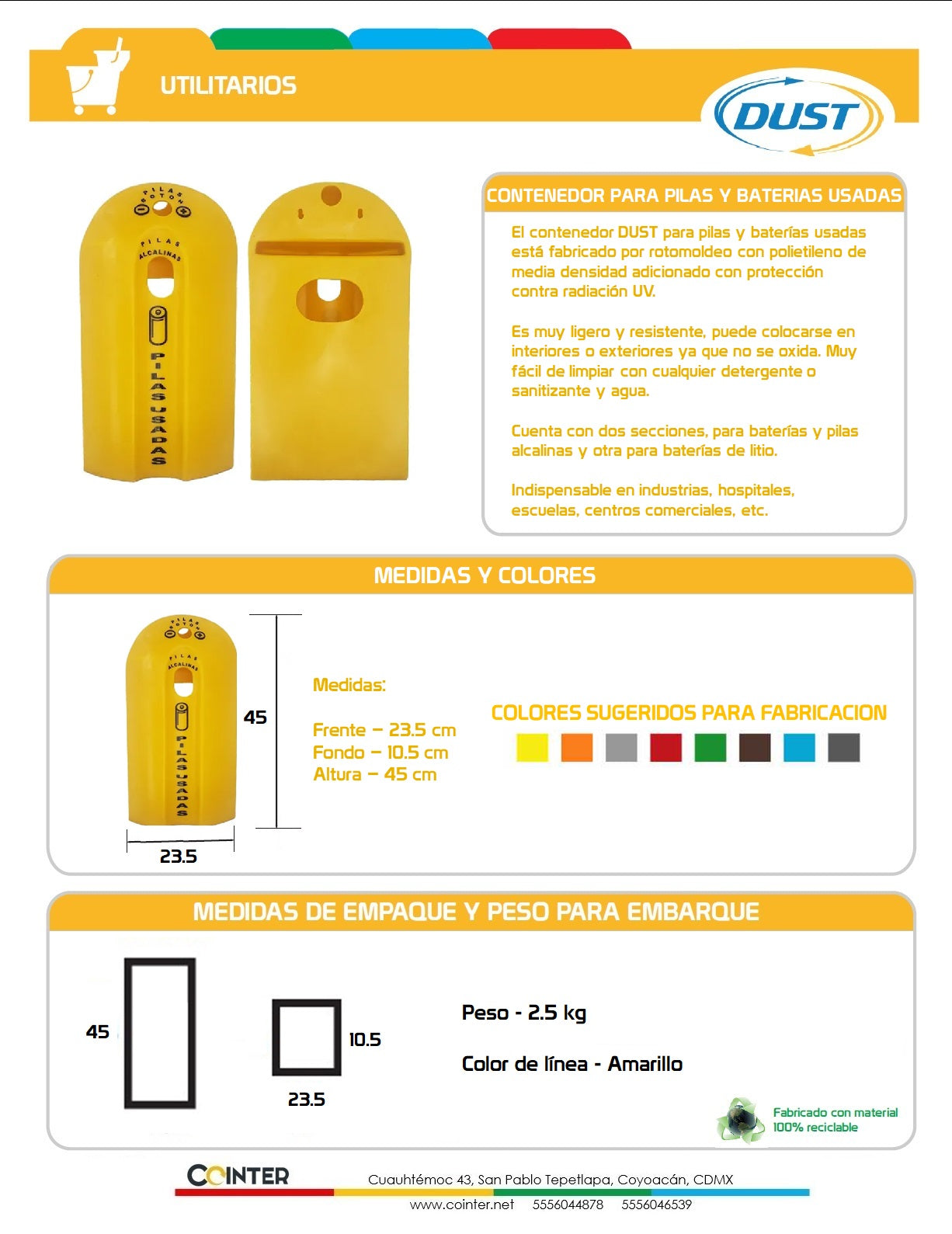 El Contenedor para Pilas y Baterías Usadas Dust Eco-battery es una herramienta esencial para cualquier entorno que busque manejar desechos peligrosos de manera responsable. Con su diseño especializado y capacidad adecuada, facilita el almacenamiento seguro y el reciclaje eficiente de pilas y baterías usadas, contribuyendo a un medio ambiente más limpio y sostenible.