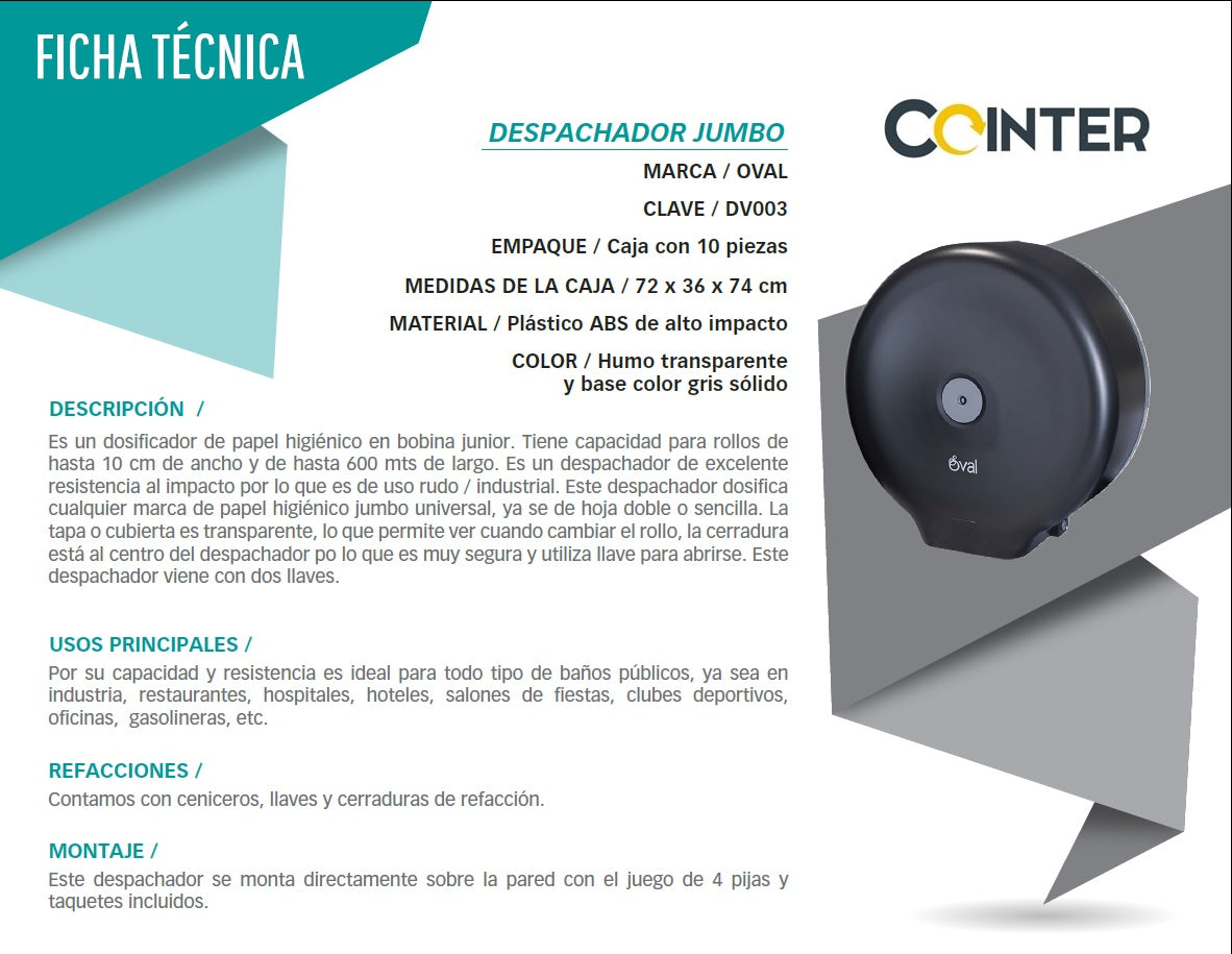 El dispensador de papel higiénico modelo DV003 es una solución robusta y práctica para baños con alto tráfico. Fabricado en plástico ABS duradero de color humo y con una base en gris sólido, este dispensador combina resistencia y estilo. Está diseñado para sostener rollos de papel higiénico tipo jumbo de hasta 600 metros de largo y 10 cm de ancho, lo que garantiza menos mantenimientos y cambios de rollo. Su tapa o cubierta transparente permite un fácil monitoreo del papel restante, y su cerradura central asegura la protección contra robos o uso indebido. Ideal para instalaciones en industrias, hospitales, escuelas y áreas de servicio donde la demanda de papel es elevada y constante.