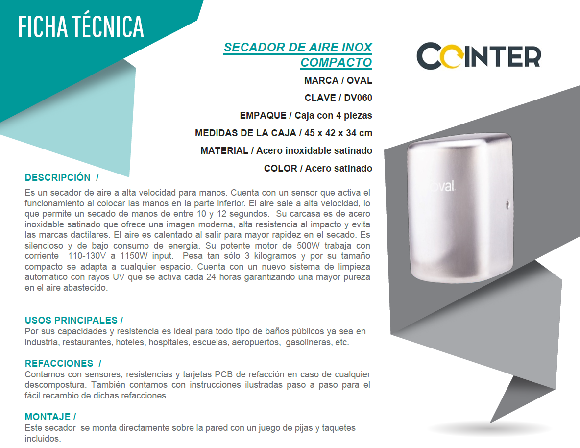 El secador de manos modelo DV060 es una solución higiénica y eficiente para baños públicos, combinando potencia y diseño en un formato compacto. Fabricado en acero inoxidable satinado, este secador no solo es duradero y resistente a impactos, sino que también presenta un aspecto moderno que se adapta a cualquier entorno. Cuenta con un sensor que activa un potente flujo de aire caliente, secando las manos en solo 10 a 12 segundos. Además, este modelo incluye una novedosa función de limpieza automática con rayos UV que se activa cada 24 horas, garantizando la eliminación de bacterias y virus en el aire, lo que lo hace ideal para lugares que requieren los más altos estándares de higiene como hospitales, aeropuertos y centros educativos. Su motor de 500W es eficiente en el consumo de energía, operando dentro de un rango de 110-130V y ofreciendo un rendimiento excepcional sin incrementar los costos operativos.