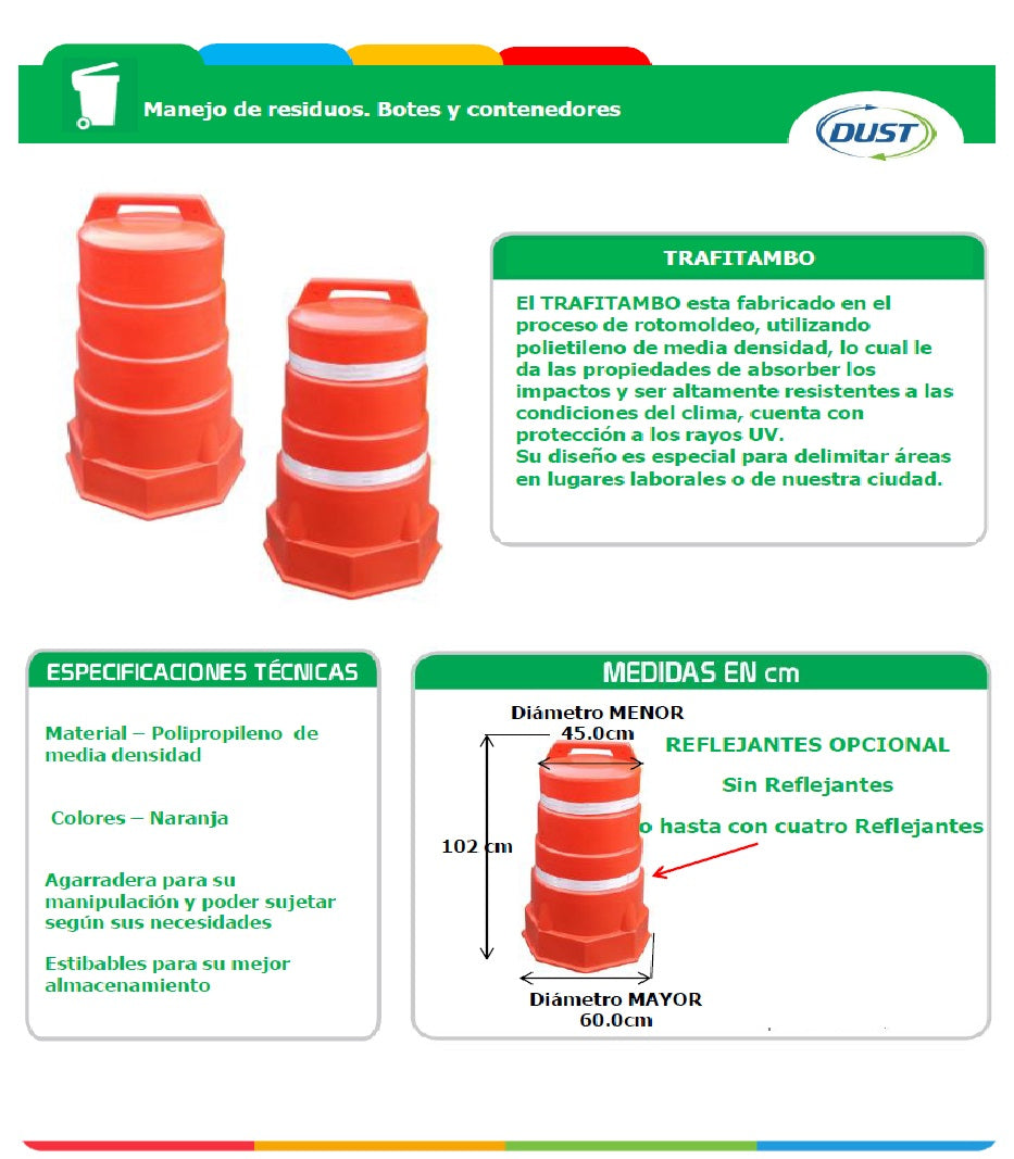 Con un diseño apilable y fácil de almacenar, el TRAFITAMBO cuenta con una agarradera que facilita su manipulación y colocación según las necesidades del usuario. Su diámetro menor es de 45 cm, y el diámetro mayor de 60 cm, con una altura de 102 cm. Además, ofrece la opción de ser equipado con hasta cuatro reflectantes para mejorar su visibilidad, ideal para utilizar en lugares con poca iluminación o en situaciones que requieren un alto grado de seguridad. Disponible en color naranja, este producto es perfecto para marcar áreas de trabajo o zonas de peligro en cualquier entorno.